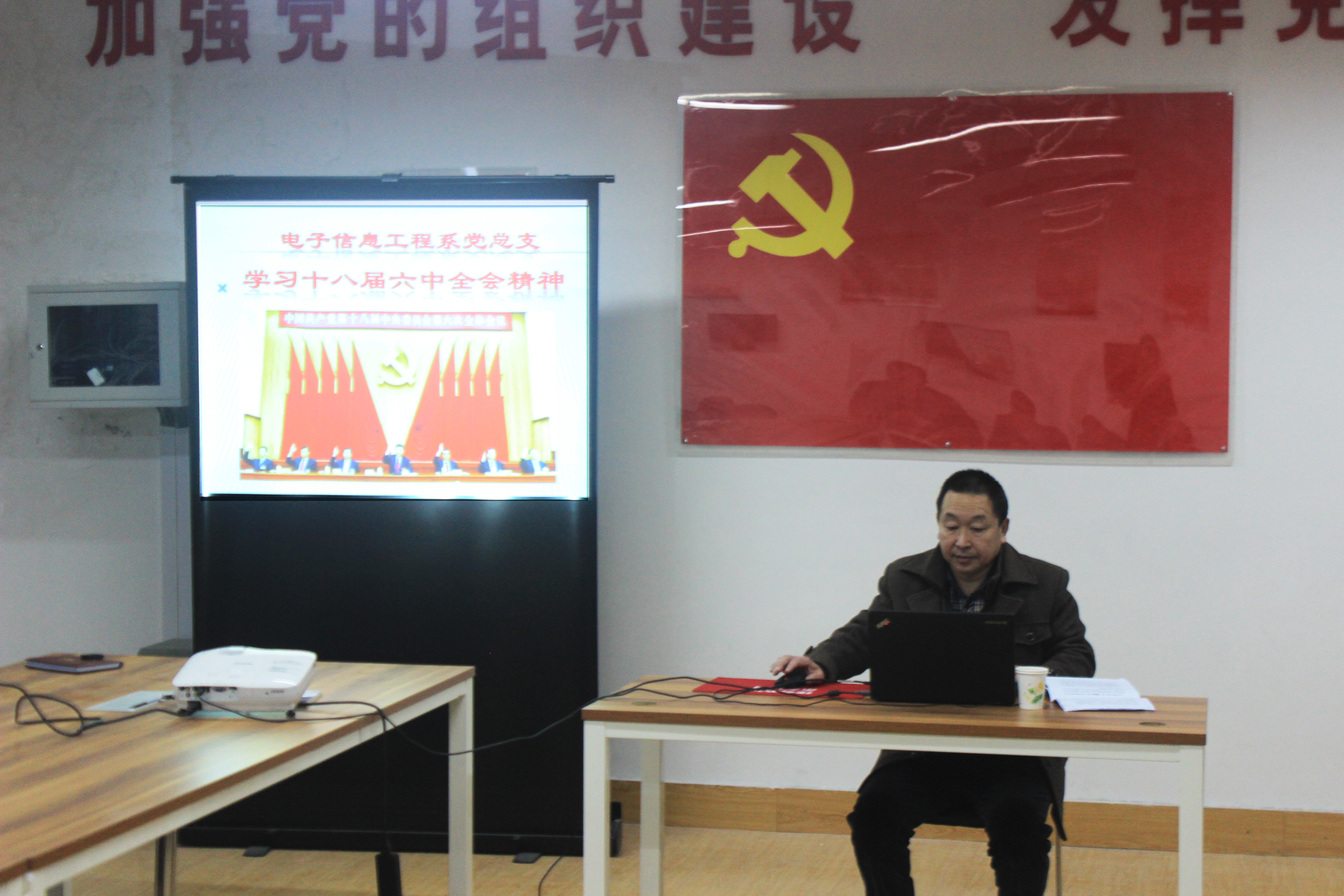 為認真學(xué)習(xí)領(lǐng)會黨的十八屆六中全會重要精神,全面加強我系黨的建設(shè),更好地推動我系各項工作開展,按照學(xué)院《關(guān)于開展十八屆六中全會精神宣講的通知》要求,電子信息工程系于1月4日邀請人文藝術(shù)教育系劉心副教授進行了十八屆六中全會精神宣講。會議由系黨總支書記袁青年同志主持,全體教師及學(xué)生入黨積極分子參加了宣講會。