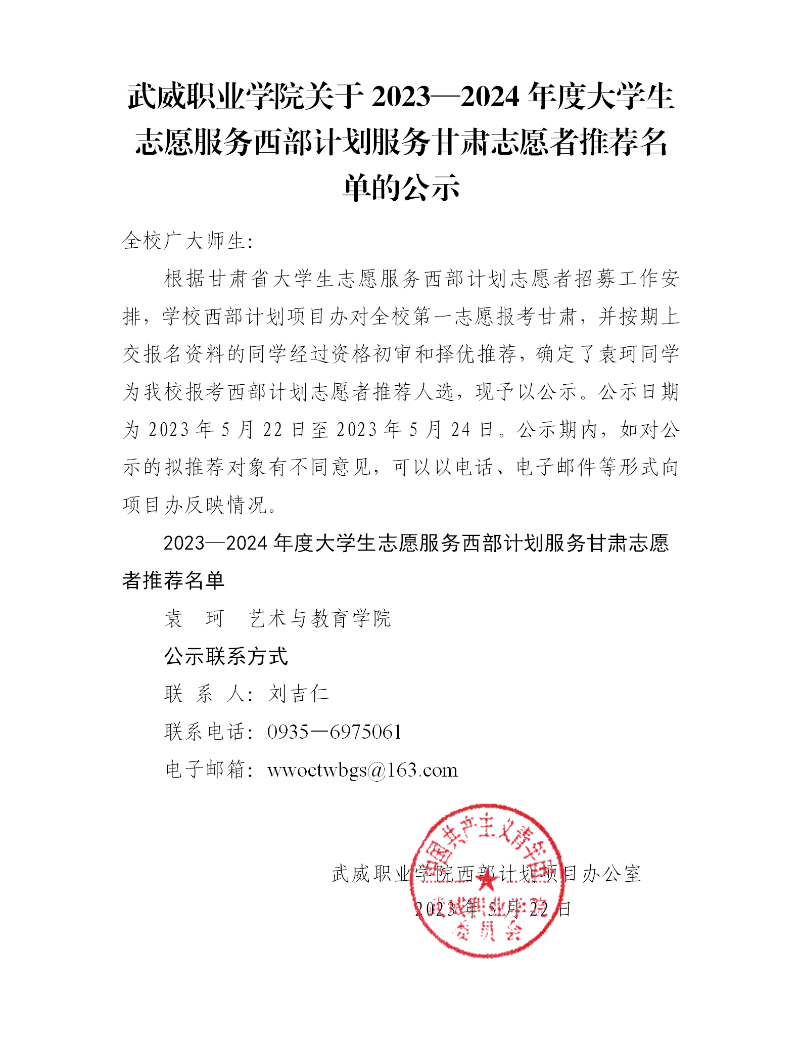 武威職業(yè)學(xué)院關(guān)于2023—2024年度大學(xué)生志愿服務(wù)西部計(jì)劃服務(wù)甘肅志愿者推薦名單的公示