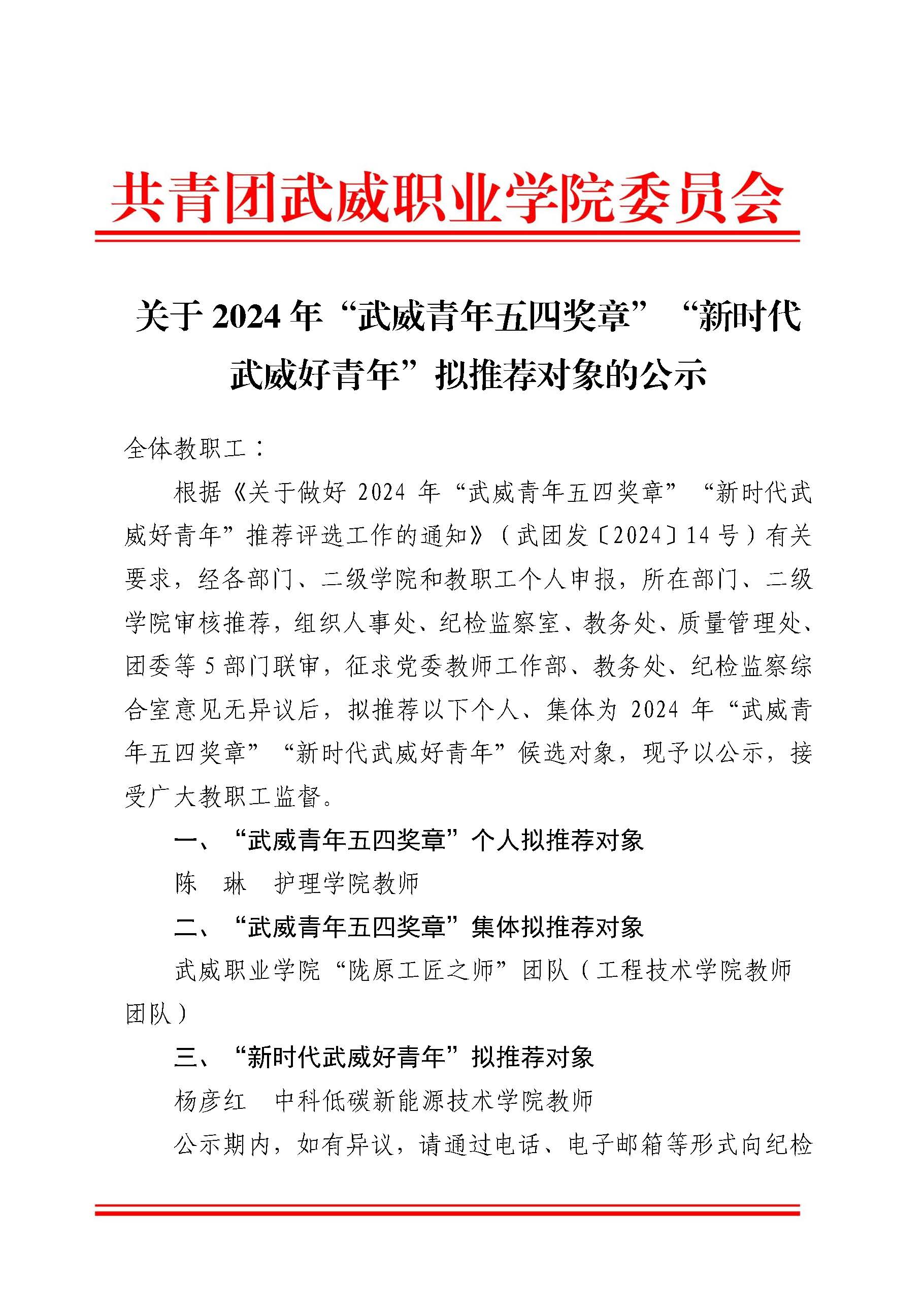 關于2024年“武威青年五四獎章“”新時代武威好青年“擬推薦對象的公示