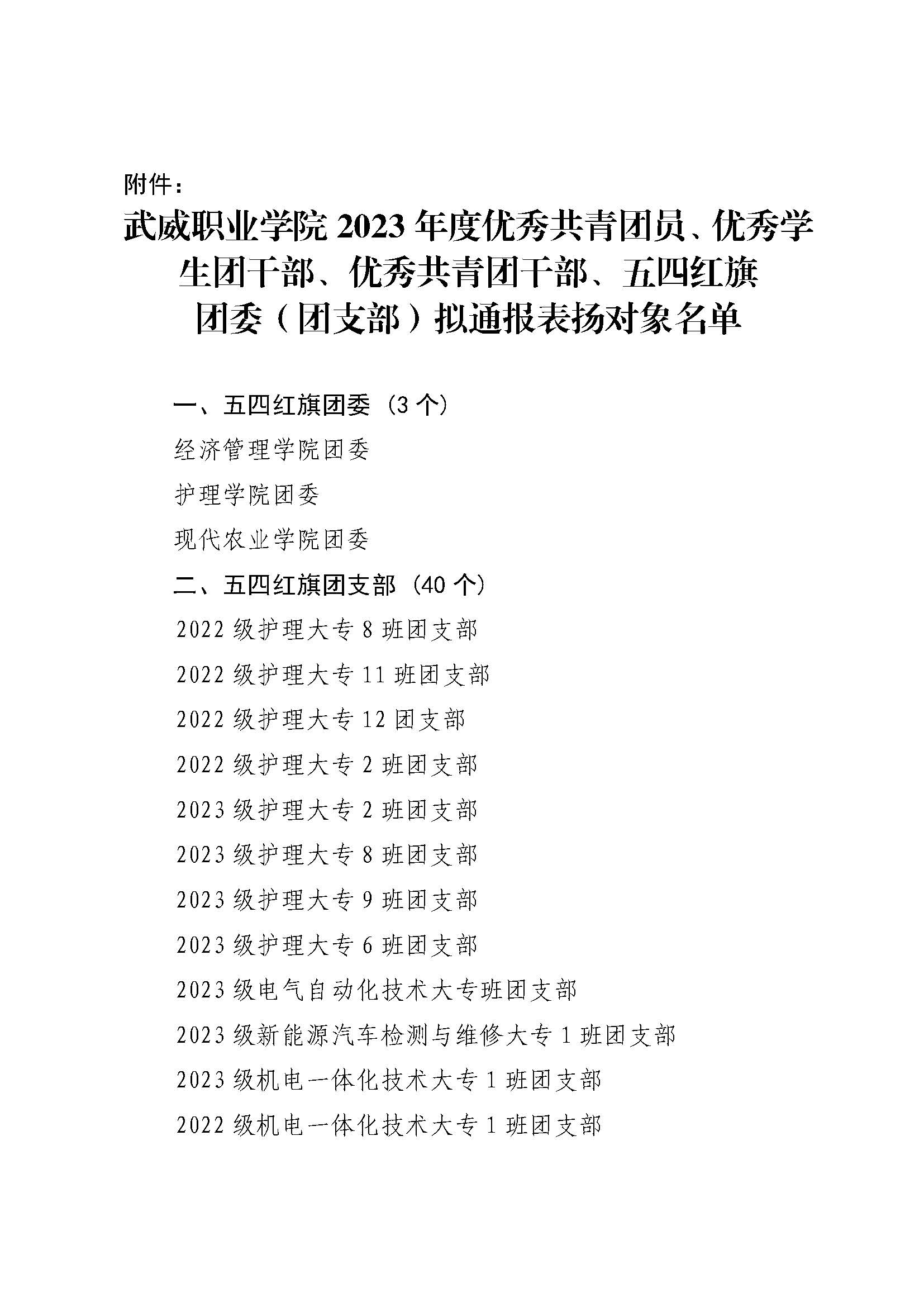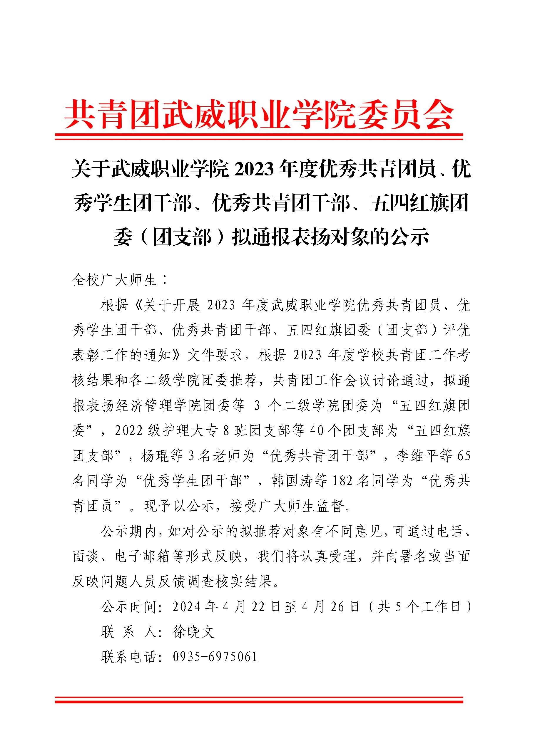 關于武威職業(yè)學院2023年度優(yōu)秀共青團員、優(yōu)秀學生團干部、優(yōu)秀共青團干部、五四紅旗團委(團支部)擬通報表揚對象的公示
