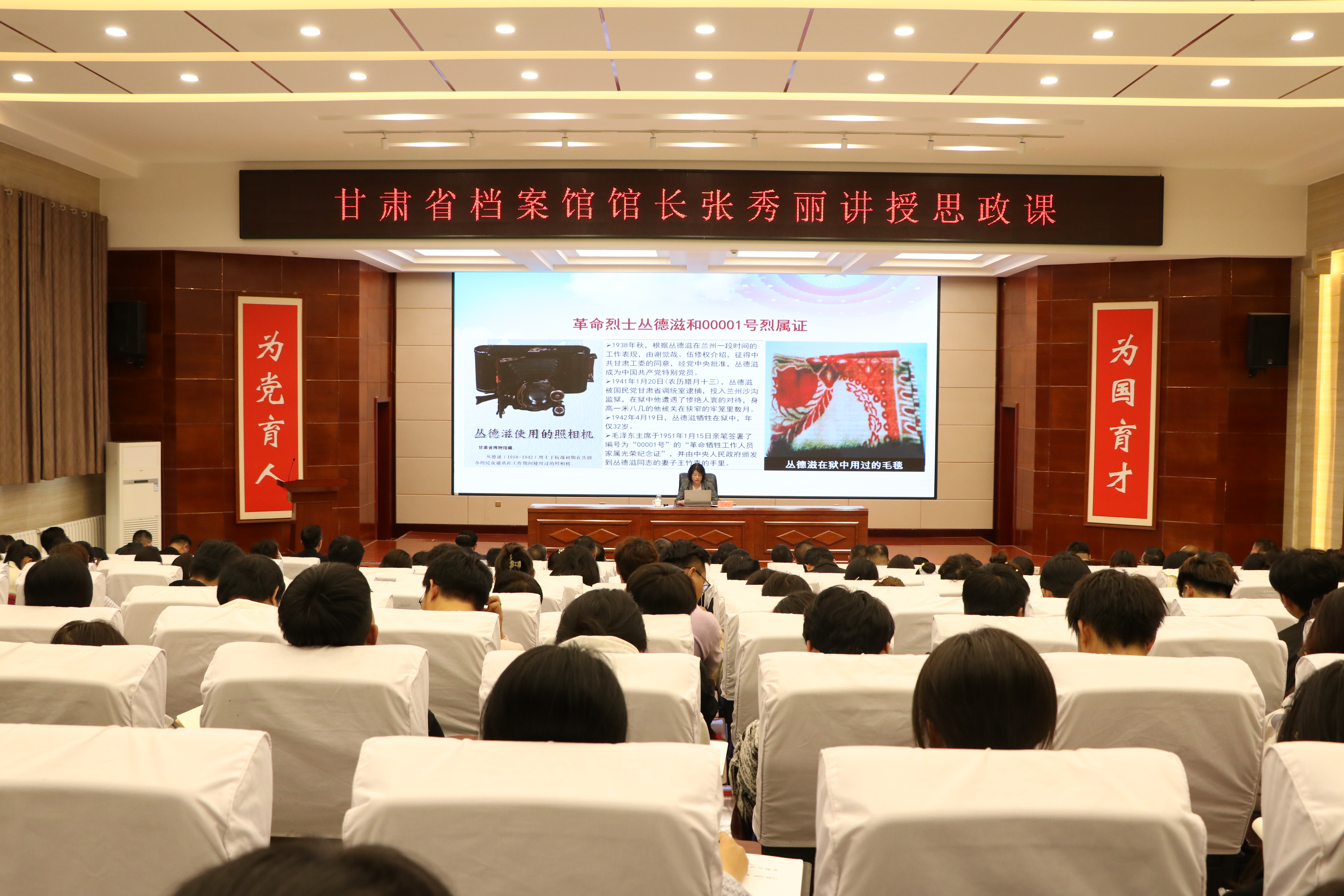 張秀麗結合自身從事檔案管理和文化研究的豐富經驗,從檔案“存史、資政、育人”根本任務出發(fā),通過大量珍貴檔案文獻和歷史案例,系統(tǒng)闡述了檔案在記錄民族苦難輝煌、服務當代治國理政、培育時代新人中的重要作用。報告中,她以館藏漢代簡牘、革命烈士叢德滋00001號烈屬證、民勤治沙檔案、甘肅地震檔案等一批具有歷史代表性和地域特色的檔案為載體,帶領師生穿越時空,感受中華民族生生不息的精神力量,深刻解讀“勿忘昨天的苦難輝煌,無愧今天的使命擔當,不負明天的偉大夢想”的時代內涵。