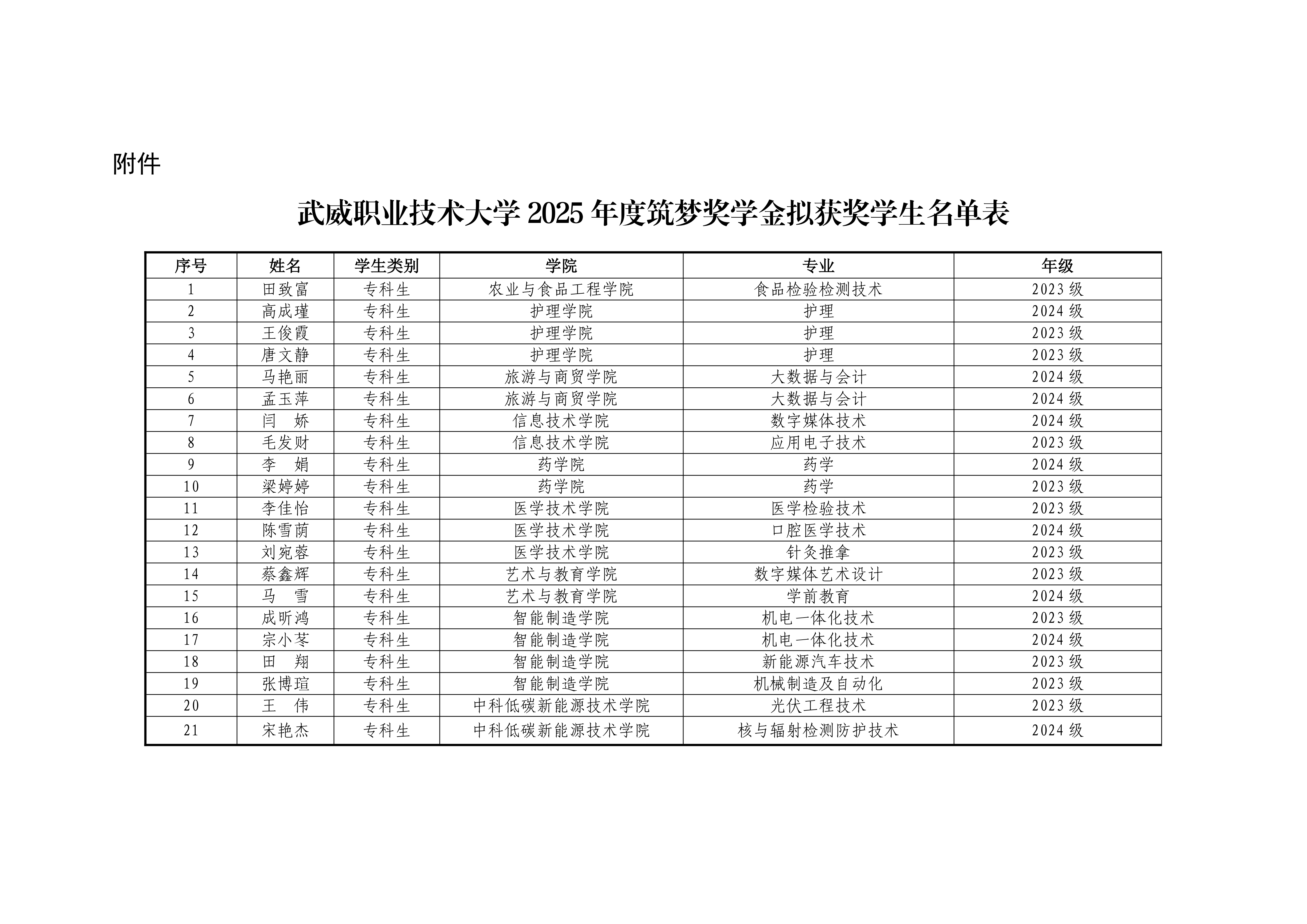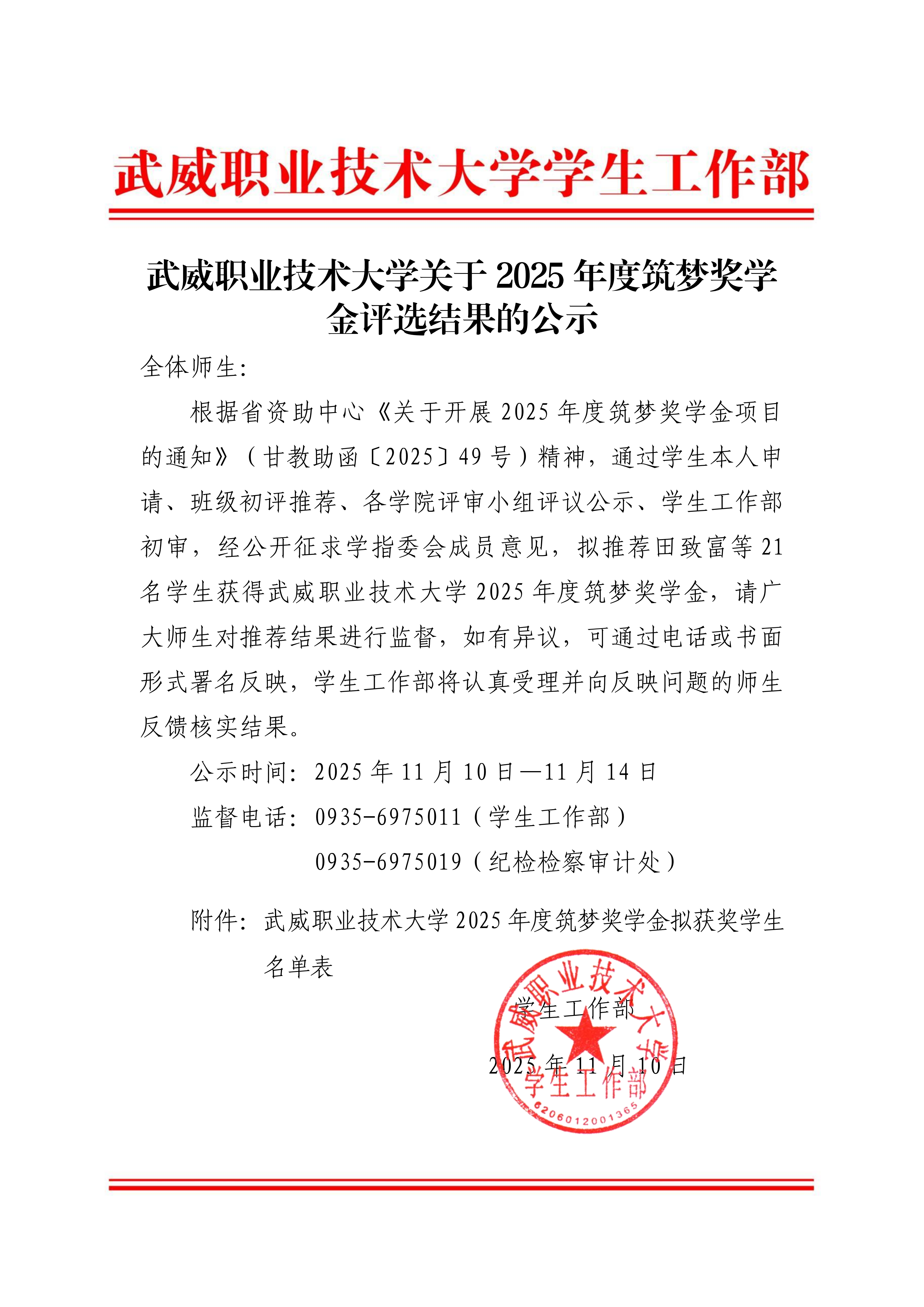 武威職業(yè)技術(shù)大學關(guān)于2025年度筑夢獎學金評選結(jié)果的公示