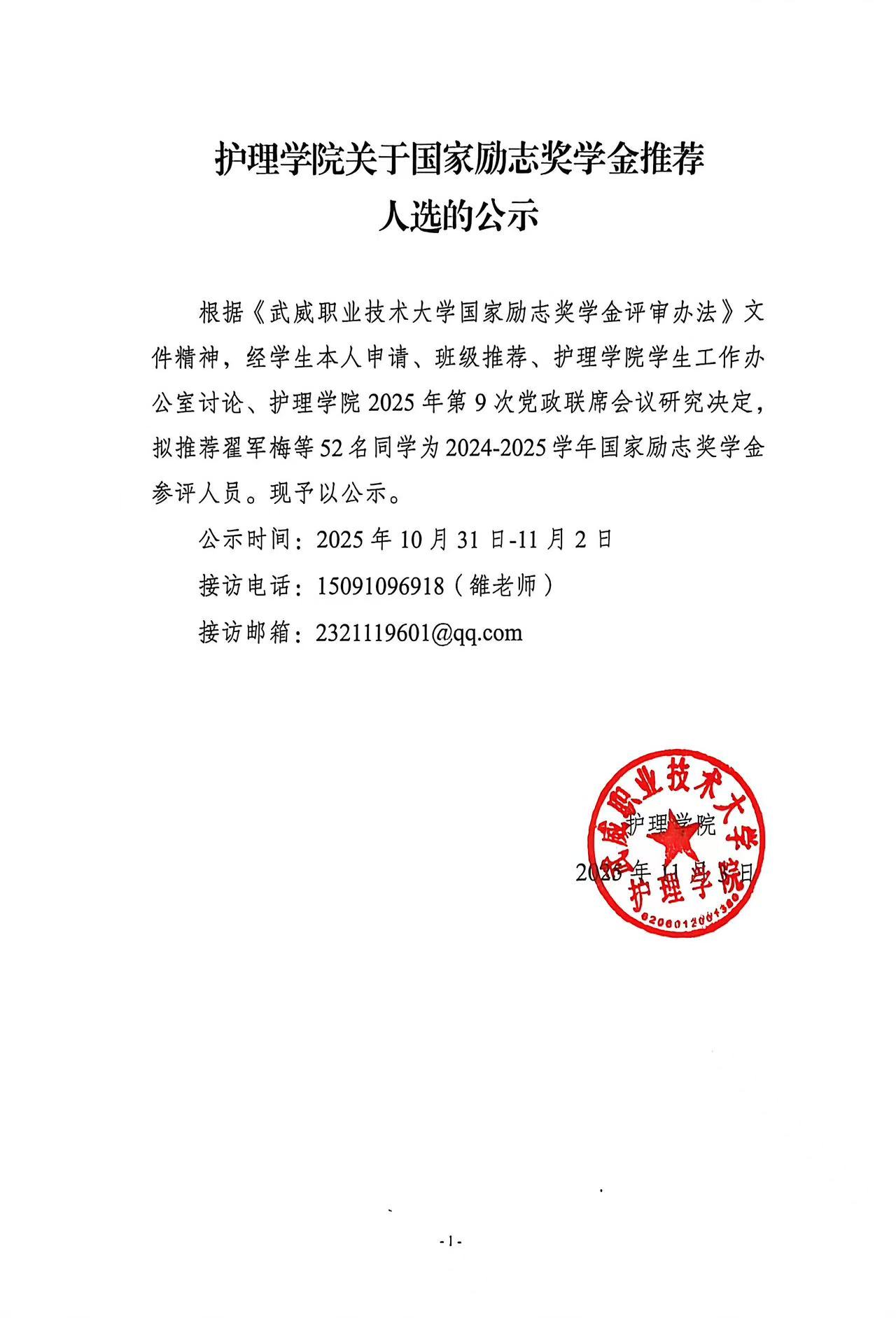 護理學院關于國家勵志獎學金推薦人選的公示