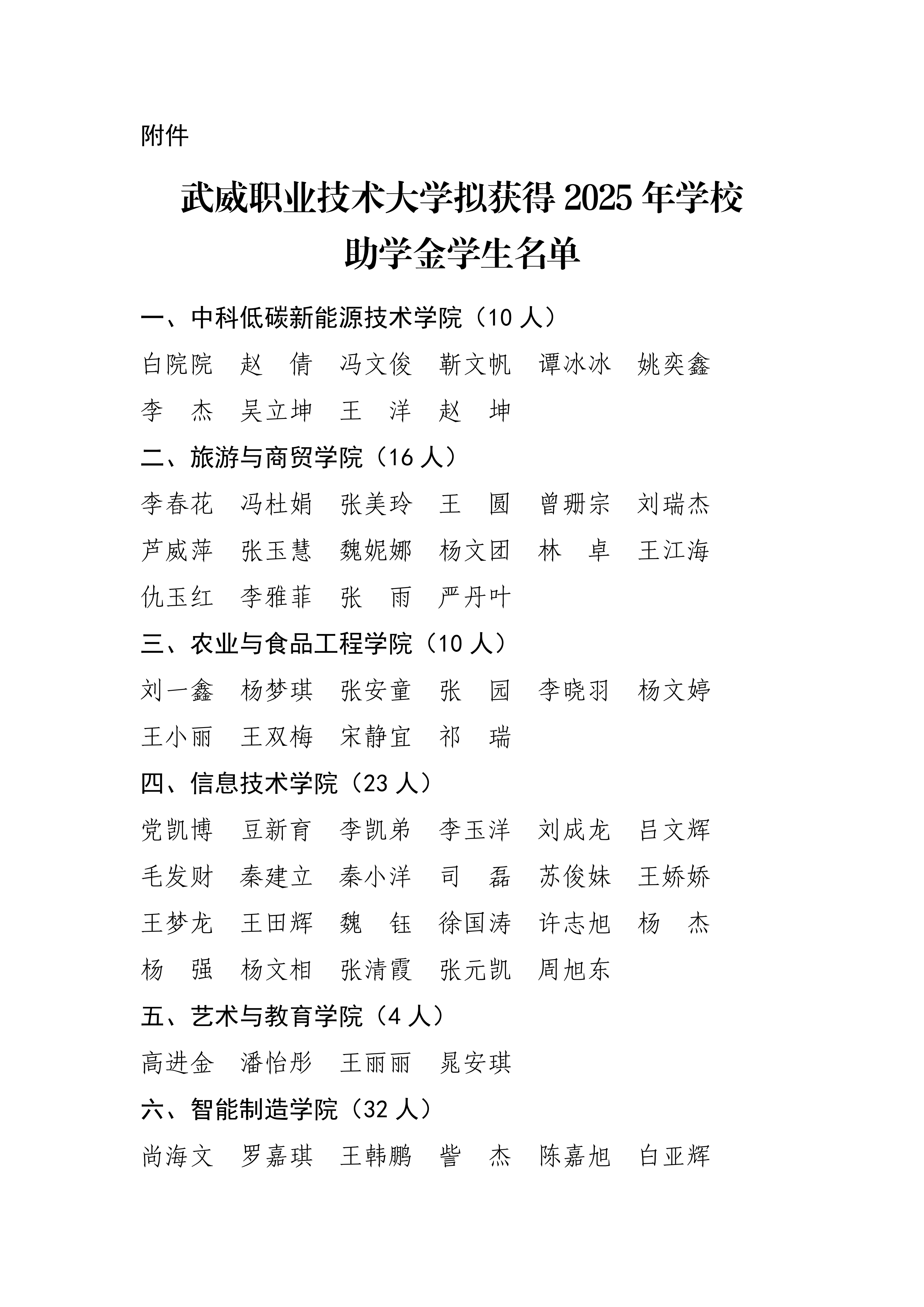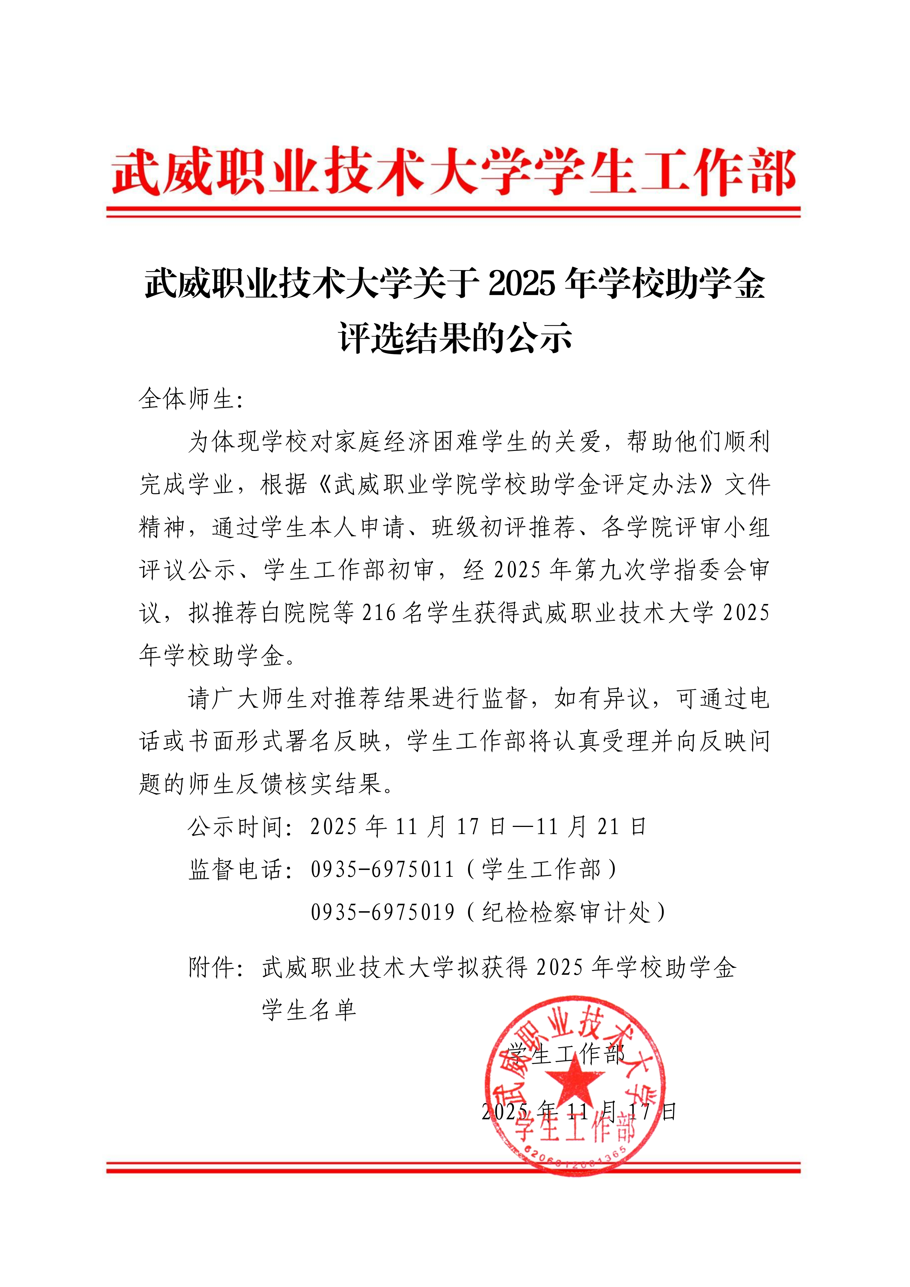 武威職業(yè)技術大學關于2025年學校助學金評選結果的公示